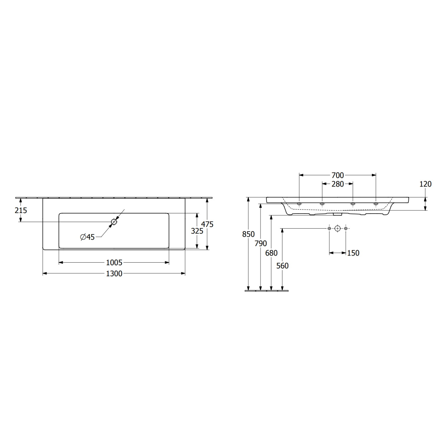 Deze wastafel van 130 cm breed, 47 cm diep en 16.5 cm komt zonder overloopgat en kraangat. Deze wastafel is daarom zeer geschikt wanneer u een badkamer heeft met inbouwkraan. Door de vorm en afmetingen is de wastafel ook ideaal voor dagelijks gebruik.