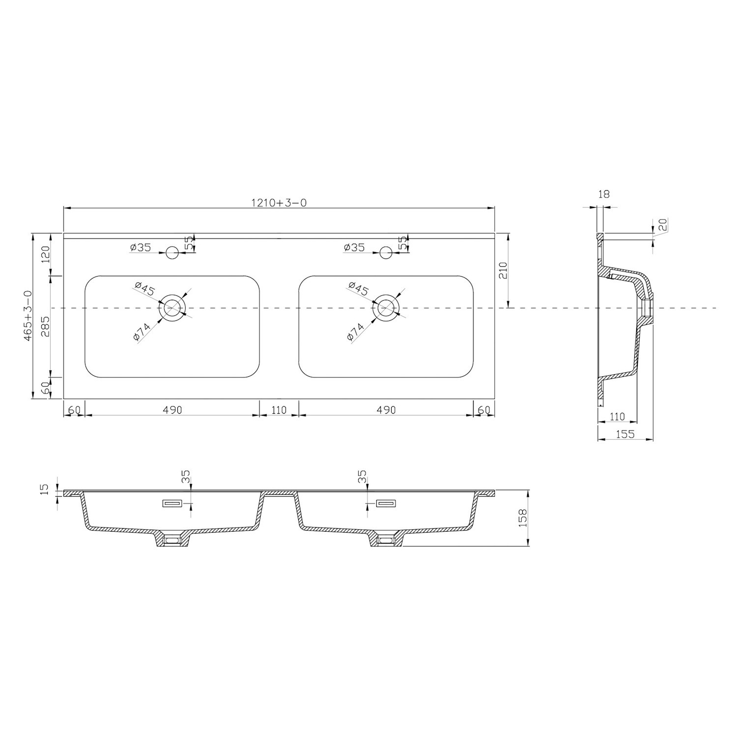 Geef een moderne look aan uw badkamer of toiletruimte met de Wiesbaden Ribbella wastafel. Deze wastafel heeft een mat zwarte kleur en heeft een breedte van maar liefst 121 cm met twee wasbakken. De wastafel is mooi te combineren met de Ribbella onderkast. De dunne plaat van de wastafel sluit de onderkast perfect af en maakt een mooi geheel. In het midden van de wasbakken bevind zich 2 kraangaten. De wasbakken bevatten een overloop, wat voorkomt dat het water over de wasbak heen kan stromen.