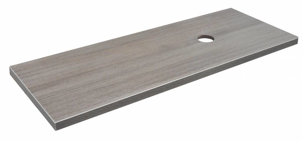 wastafelblad<br/> 1200 x 460 x 36<br/> voor 1 wastafel<br/> houtnerf grijs Dit blad combineren met een ladekast en een vierkante beugel<br/> wastafel zowel links als rechts te plaatsen<br/> Eventueel kraangat zelf aan te brengen<br/>