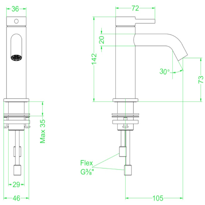 De wastafelkraan heeft een hoogte van 14,2 cm, heeft een hoogte uitloop 7,3 cm, heeft een diepte uitloop 10,5 cm, heeft draadaansluiting van (inch) 3/8 en is een mengkraan.