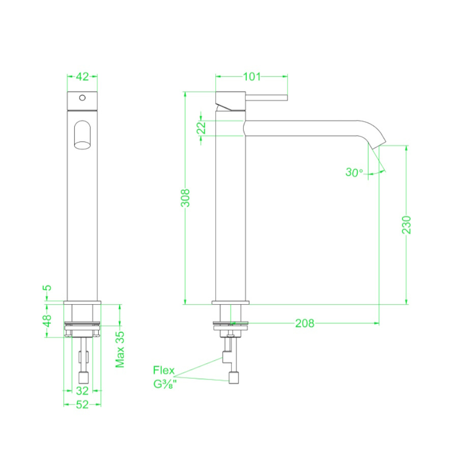 De wastafelkraan heeft een hoogte van 30,8 cm. Heeft een uitloop hoogte van 23 cm en een uitloop diepte van 20,8 cm. De kraan heeft een draadaansluitmaat van (inch) 3/8.