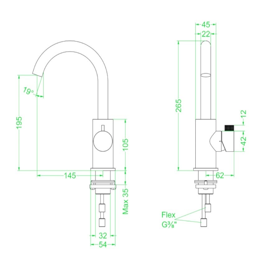 De wastafelkraan heeft een hoogte van 26,5 cm, heeft een hoogte uitloop 19,5 cm, heeft een diepte uitloop 14,5 cm, heeft draadaansluiting van (inch) 3/8 en is een mengkraan met een draaibare uitloop.