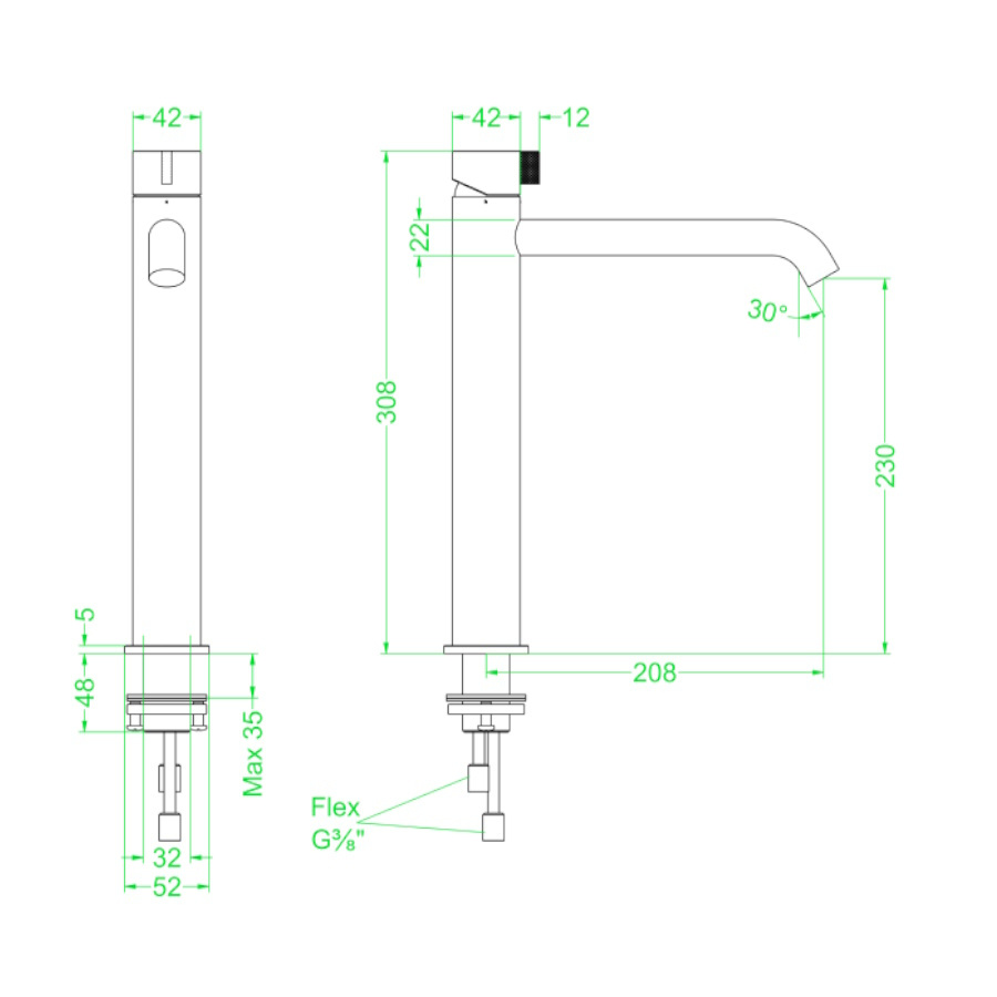De wastafelkraan heeft een hoogte van 30,8 cm. Heeft een uitloop hoogte van 23 cm en een uitloop diepte van 20,8 cm. De kraan heeft een draadaansluitmaat van (inch) 3/8.