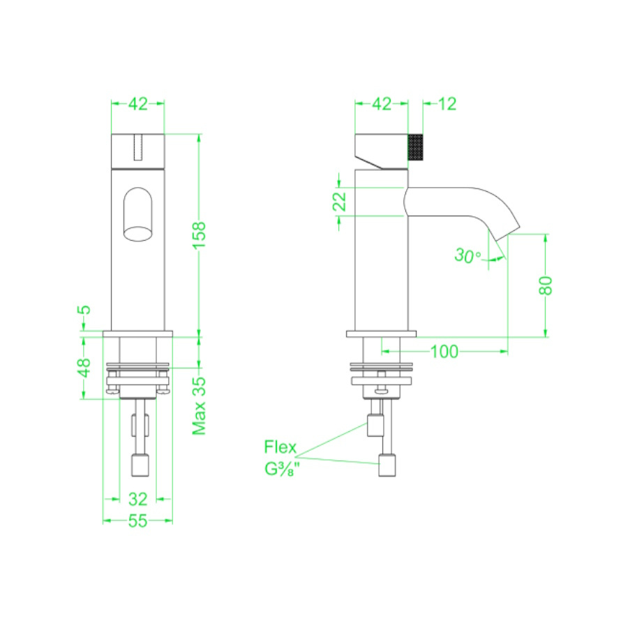 De wastafelkraan heeft een hoogte van 15,8 cm. Heeft een uitloop hoogte van 8 cm en een uitloop diepte van 10 cm. De kraan heeft een draadaansluitmaat van (inch) 3/8.