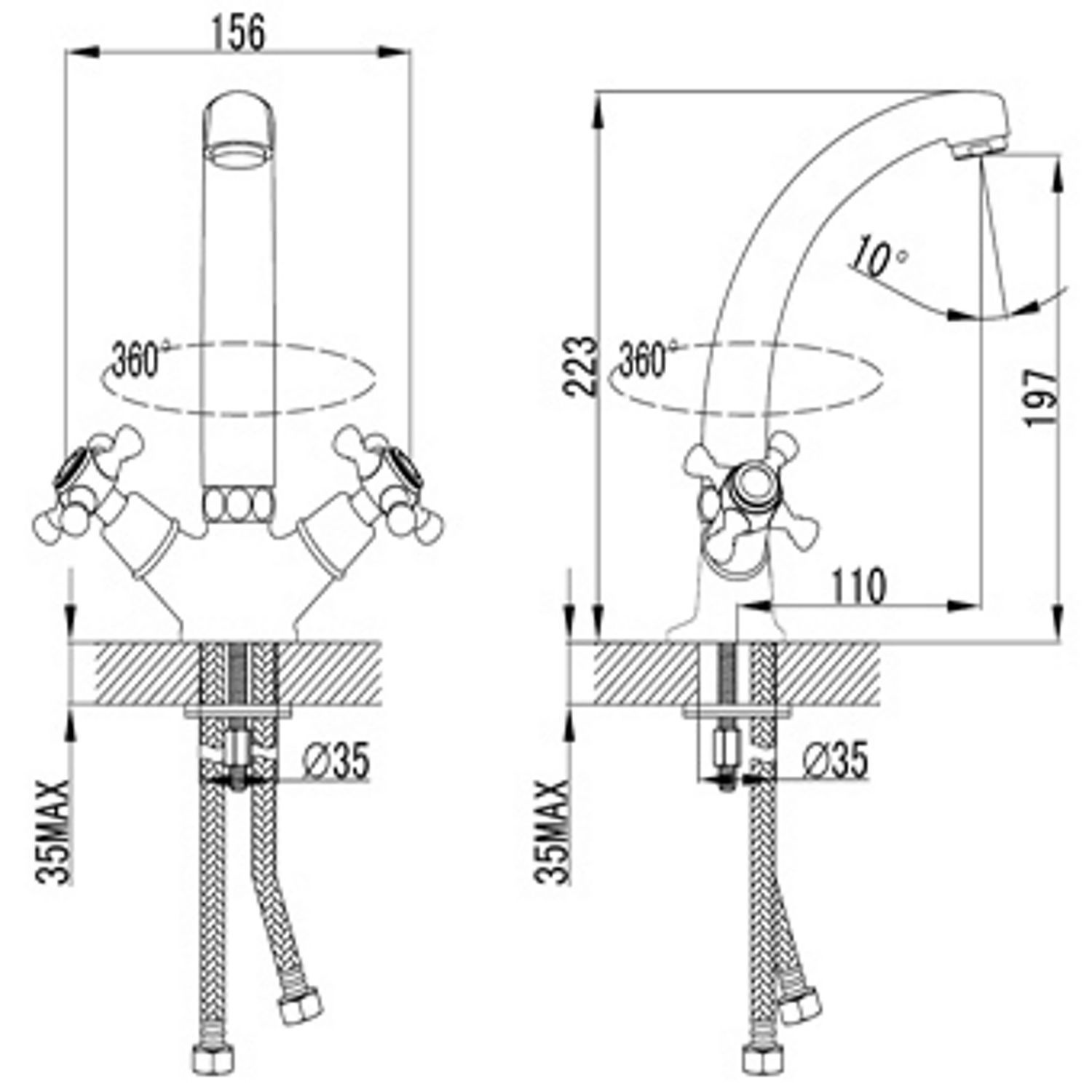 Met de kruisgrepen bepaalt u zelf de temperatuur door warm en koud water te mengen. De uitloop is niet uittrekbaar, maar wel draaibaar.