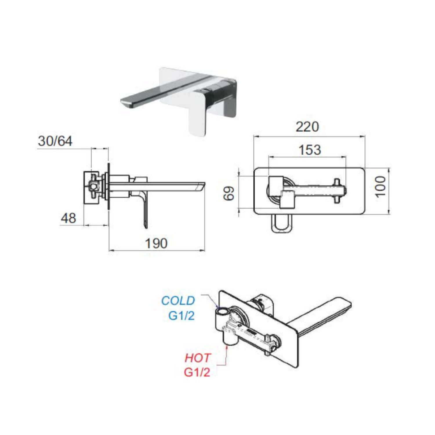De uitloop heeft een lengte van 19 cm. De wastafelkraan dient in de wand bevestigd te worden en wordt exclusief waste geleverd.