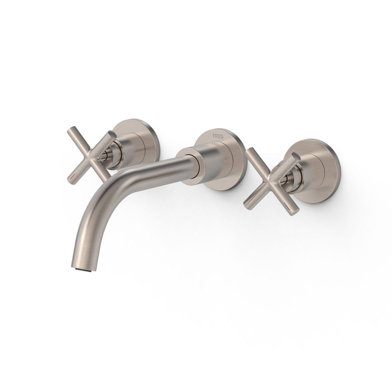 De kraan heeft een losse uitloop met aan weerszijden een kruisgreep. De kraan is gemaakt van messing. Dat is een zeer sterke staalsoort en goed bestand tegen schimmels en bacteriën. Daarom is het uitermate geschikt voor kranen. De bijgevoegde rozetten hebben een diameter van 5.8 cm om de gaten in de muur te bedekken en de draadaansluiting is 1/2".