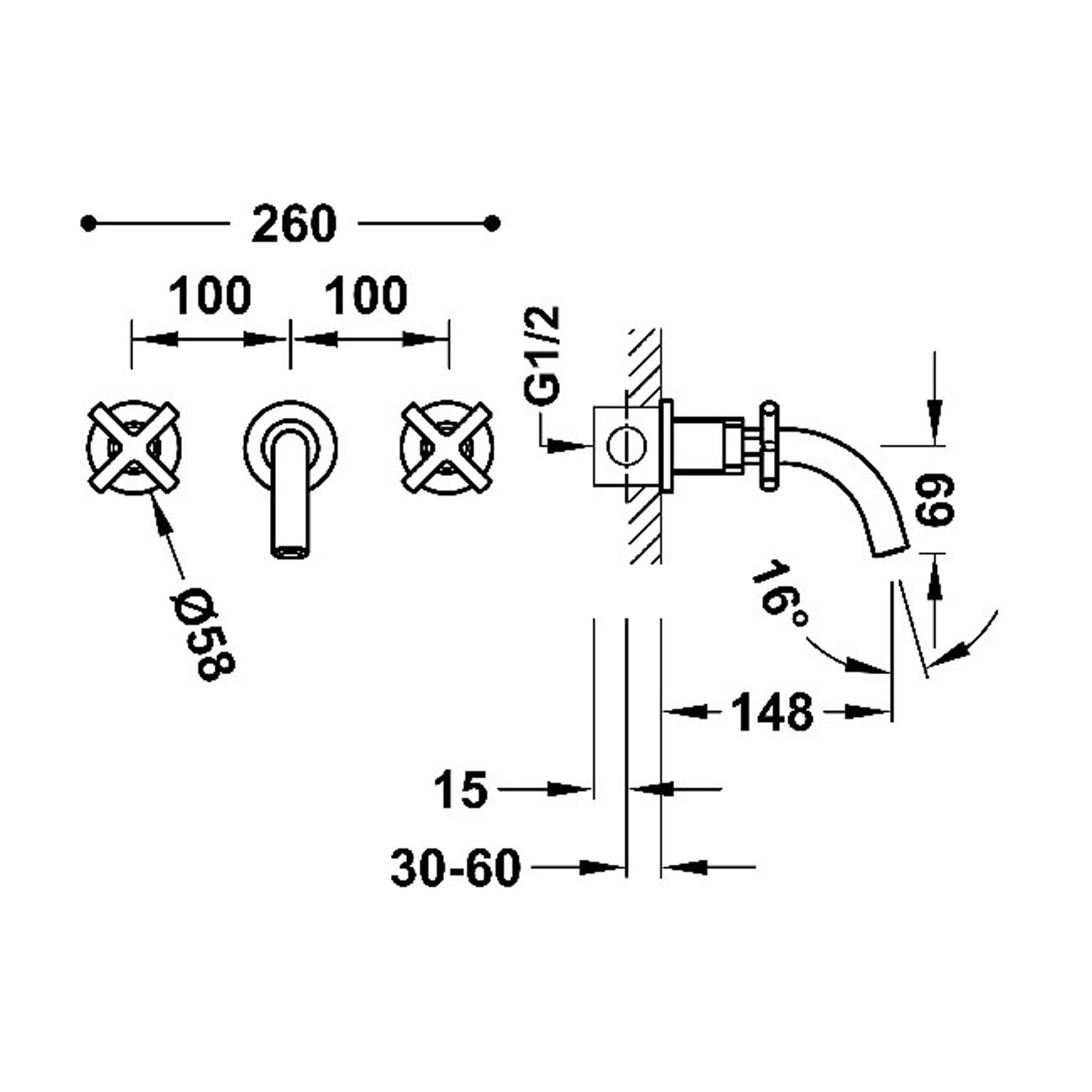 Deze inbouwkraan heeft een uitloop met een lengte van 14.8 cm. Dat is ook direct het diepste deel van deze kraan dus de kraan steekt 14.8 cm uit vanaf de muur.