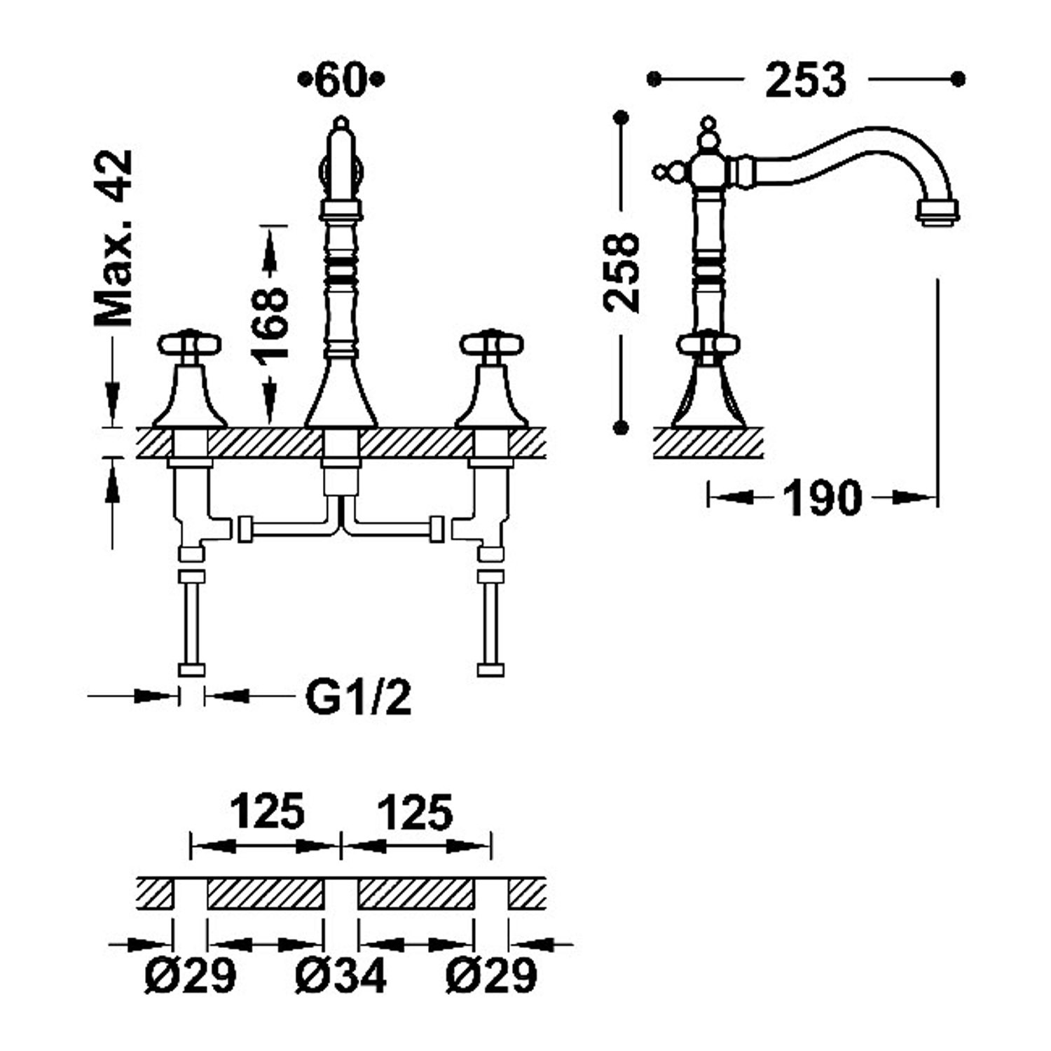 De totale hoogte van de kraan is 25.8 cm en hij is 25.3 cm diep. Omdat het een mengkraan is, bepaald u zelf de temperatuur door het warme en koude water te mengen. Om de kraan aan te sluiten is er een kraangat van 3,4 cm doorsnede. De gaten van de grepen zijn iets kleiner, namelijk 2.9 cm.