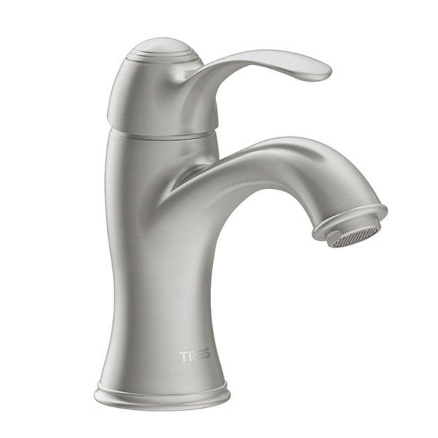 Deze wastafelmengkraan van de serie 'Clasic' van Tres heeft, zoals de serienaam al zegt een klassiek uiterlijk. De kraan is elegant en speels door zijn gebogen uitloop en hendel. Hij heeft een hoogte van 16 cm en een diepte van 16,9 cm. De uitloop is 8,7 cm hoog en 12,7 cm lang.