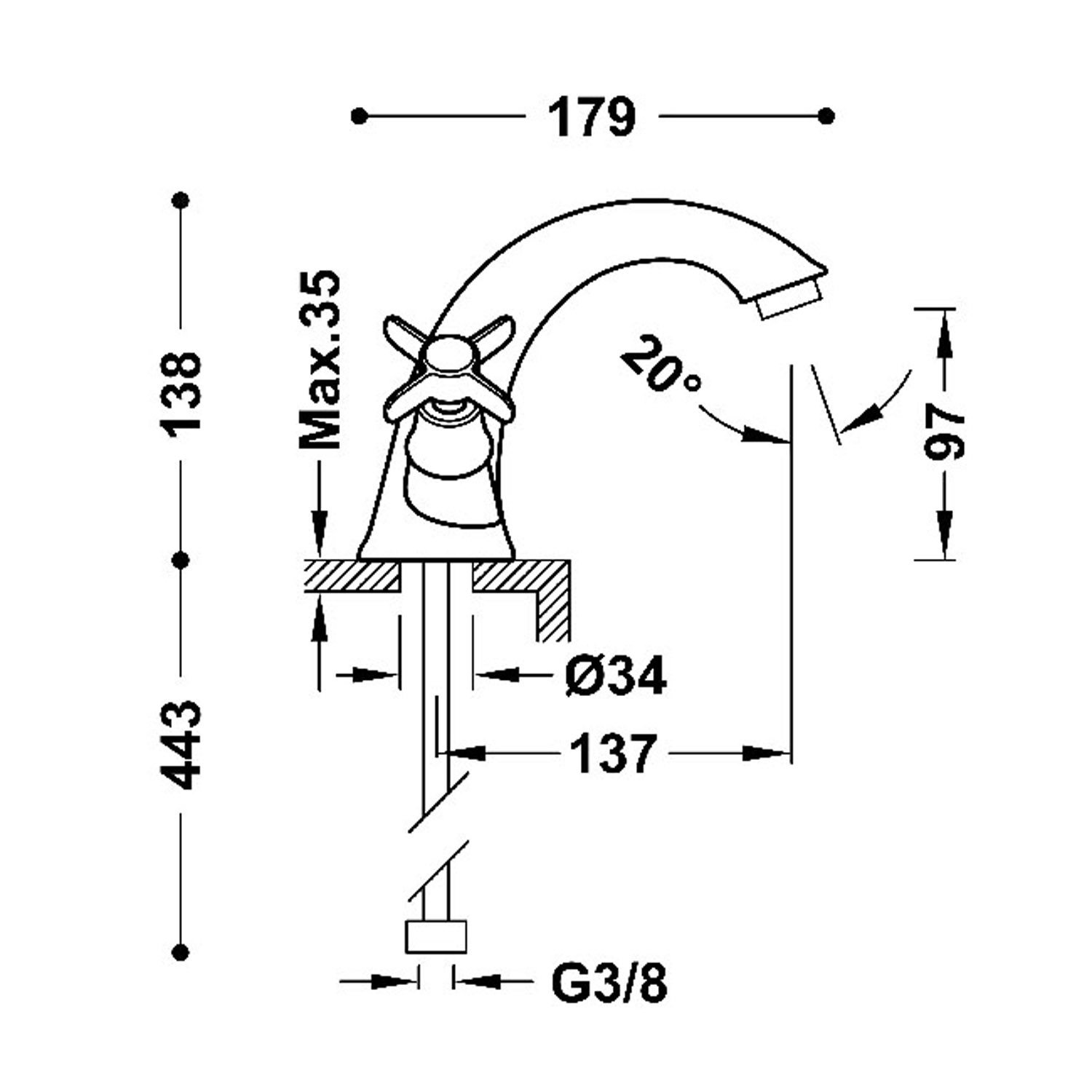 Om de kraan aan te kunnen sluiten, heeft de kraan een kraangat met een afmeting van 3.4 cm en een draadaansluiting van 3.8 inch