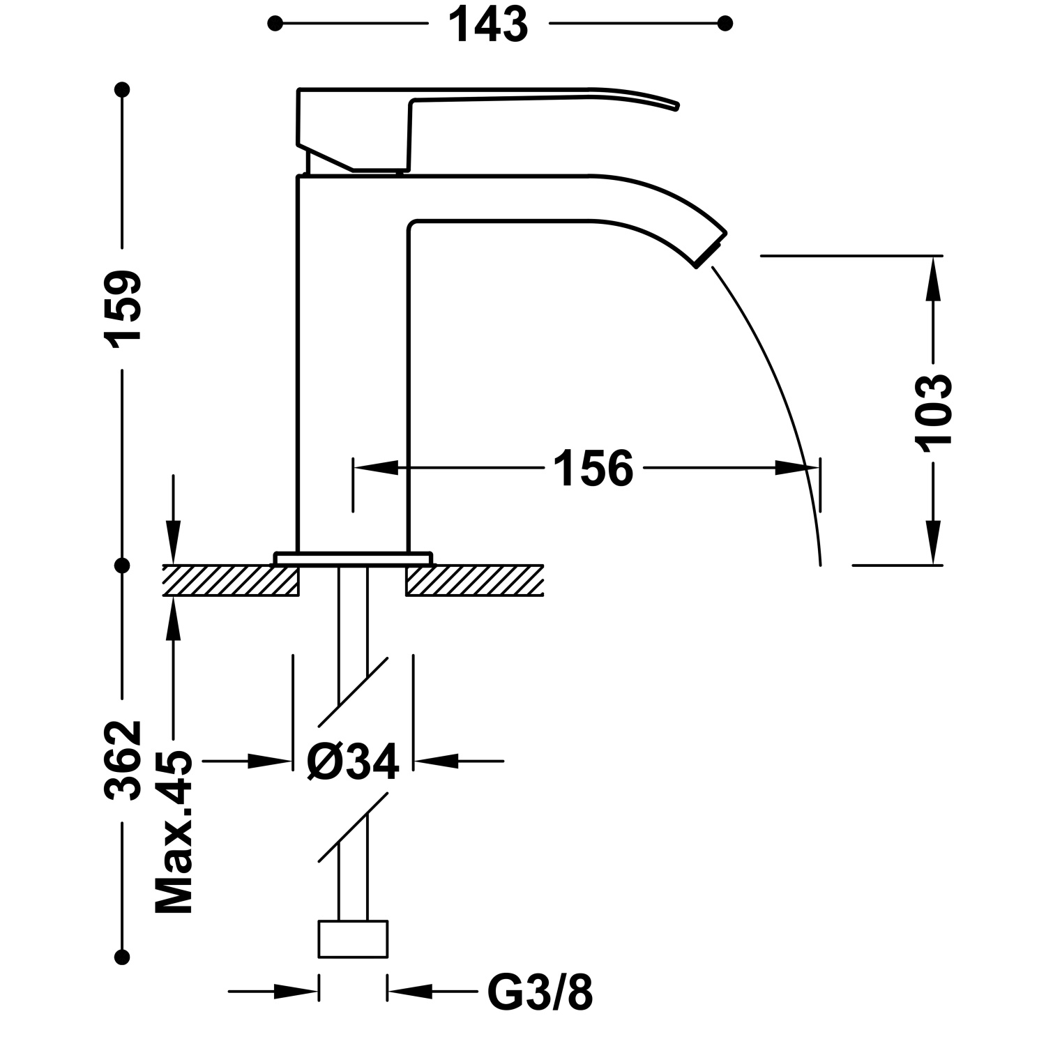 De kraan heeft een hoogte van 15,9 cm en een diepte van 14,3 cm.