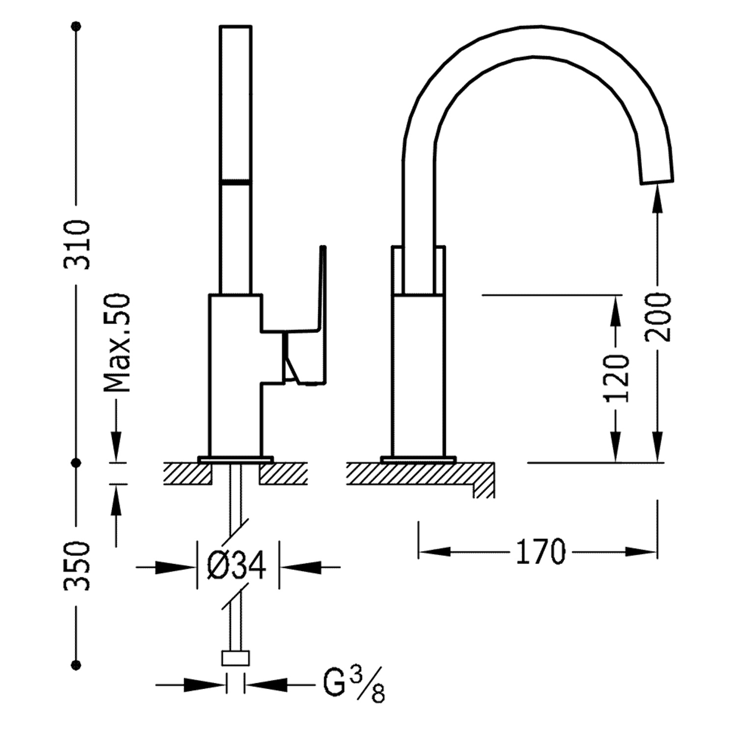 De kraan heeft een hoogte van 31 cm. De uitloop is 20 cm hoog en 17 cm lang.