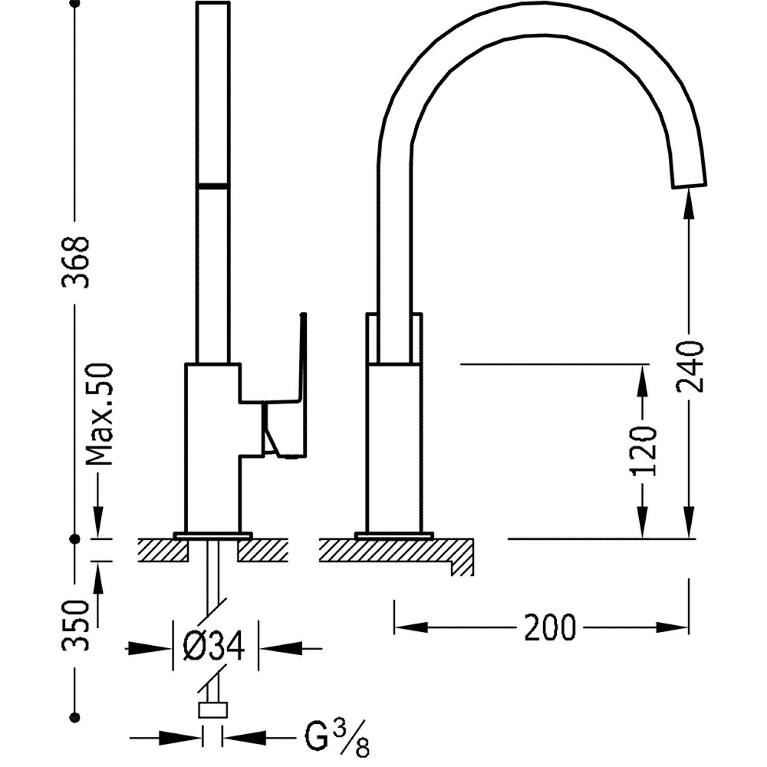 De kraan heeft een hoogte van 36,8 cm. De uitloop is 24 cm hoog en 20 cm lang.