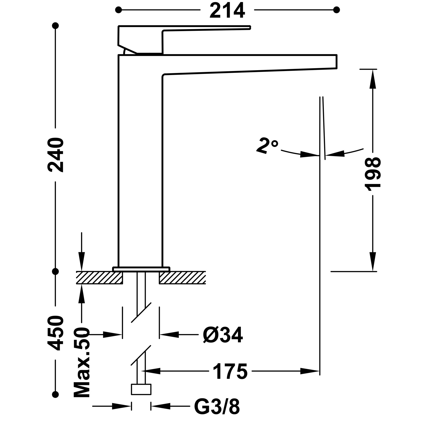 De kraan heeft een hoogte van 24 cm en is 21,4 cm diep. De uitloop is 19,8 cm hoog en 17,5 cm lang. Het gat heeft een diameter van 3,4 cm. De aansluiting is 3/8".