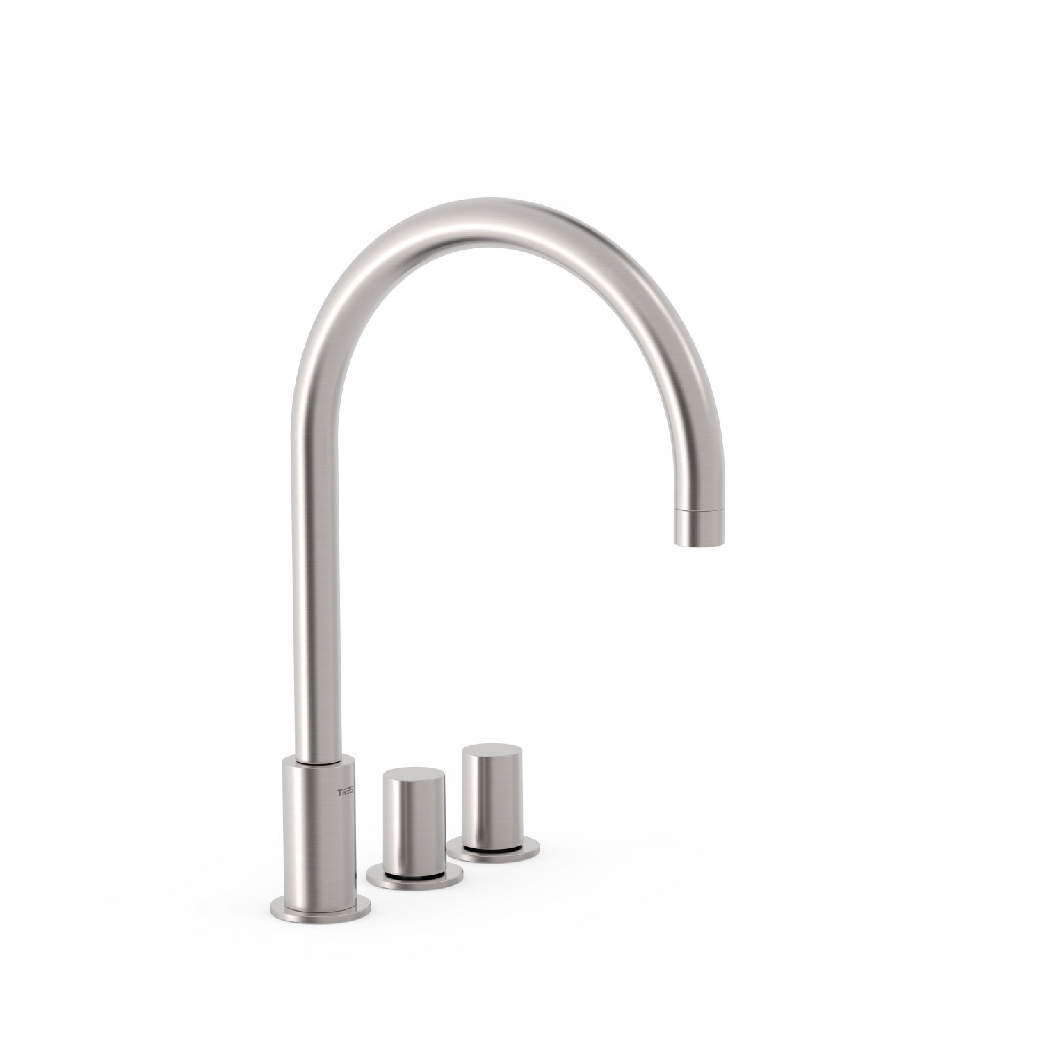 Met deze wastafelkraan van de serie 'Study Exclusive' van Tres haalt u design in huis. Zijn ronde vorm maakt hem strak, modern en elegant. De uitloop is gebogen. Hij is van messing in RVS look. Deze kraan onderscheidt zich met zijn 3-delige design. De twee draaiknoppen zijn namelijk los van de uitloop van de kraan. Alles bevestigt u aan de wastafel.