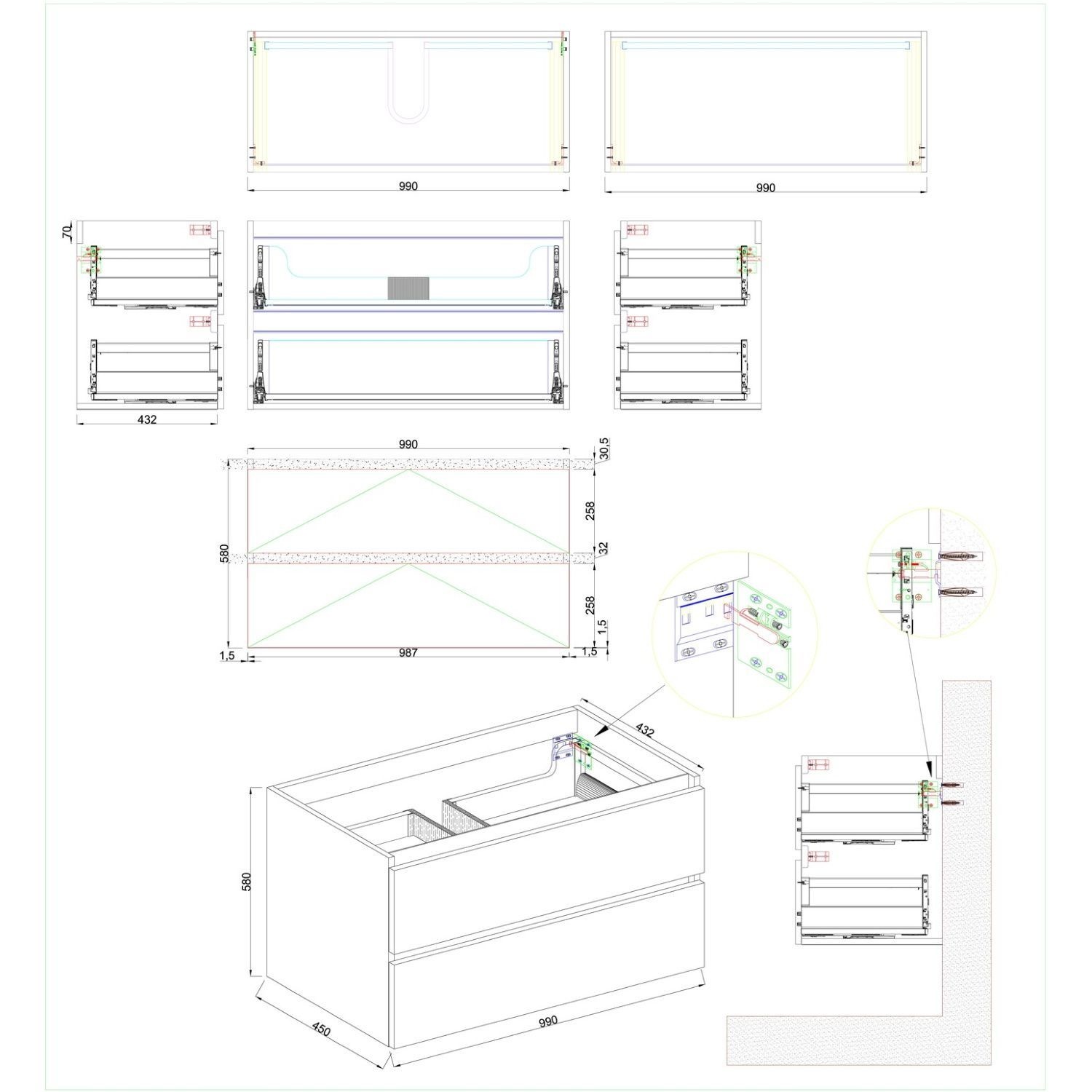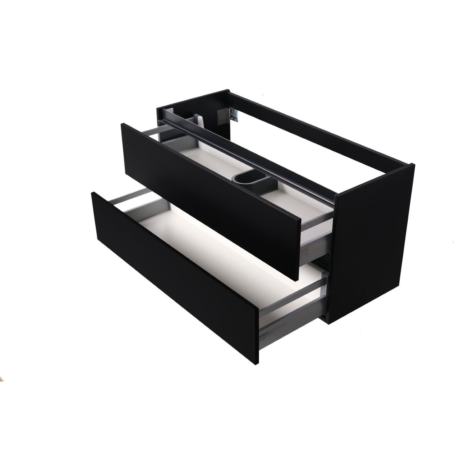 De Maia wastafelmeubel van het merk Boss & Wessing is een prachtige aanwinst voor in uw badkamer. De onderkast heeft een stijlvol design en een fraaie mat zwarte afwerking. De onderkast bevat twee softclose lades waarin uw toiletartikel bij de hand en netjes kan opbergen. Het softclose systeem van de lades zorgt er voor dat de lades geleidelijk en geruisloos dichtvallen zonder uw kast te beschadigen. De bijpassende topblad kunt u onderaan de pagina eenvoudig bijbestellen. De onderkast heeft een breedte van 99 cm, een hoogte van 58 cm en een diepte van 45 cm.