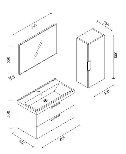 Wiesbaden-2 , badmeubel 800x420 met keramische wastafel, Hoogte 500mm, Diepte 420mm, inclusief spiegel 800x550x20 met aluminium rand, en zijkastje 800x350x250 (keuze links of rechts), Softclose, Kleur: hoogglans gelakt, wit, Verzonken handgrepen, Luxe DTC
