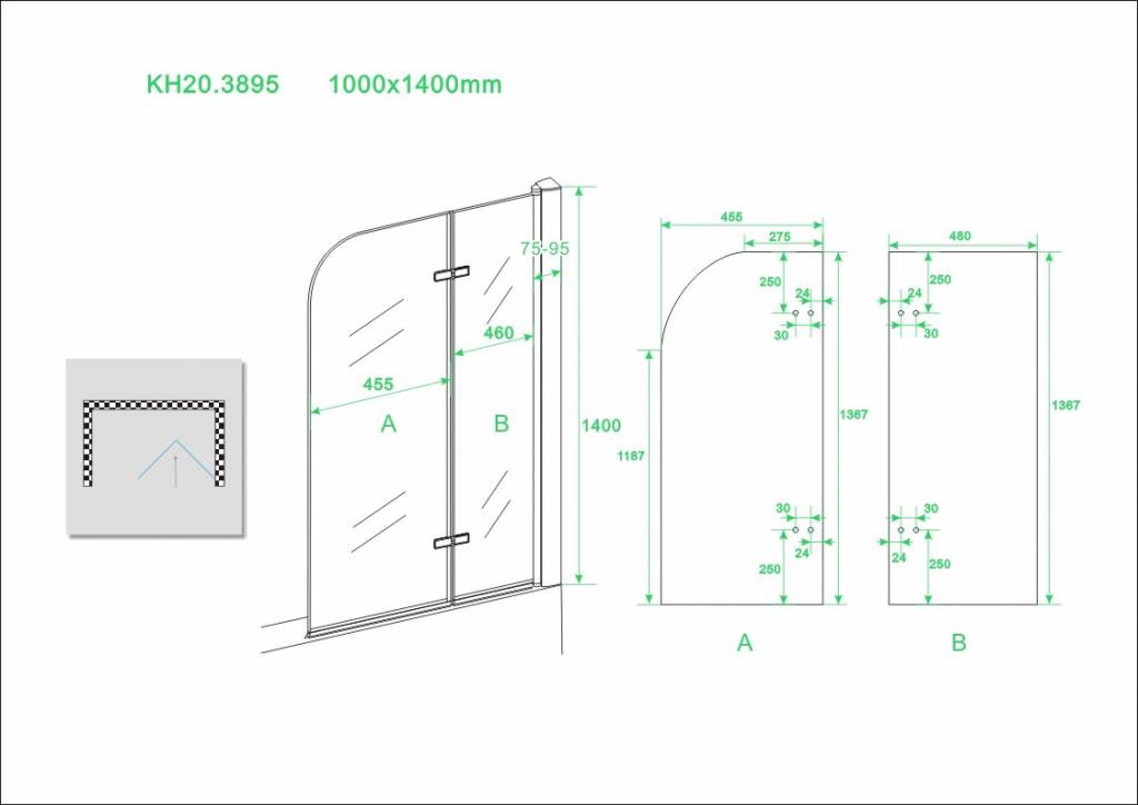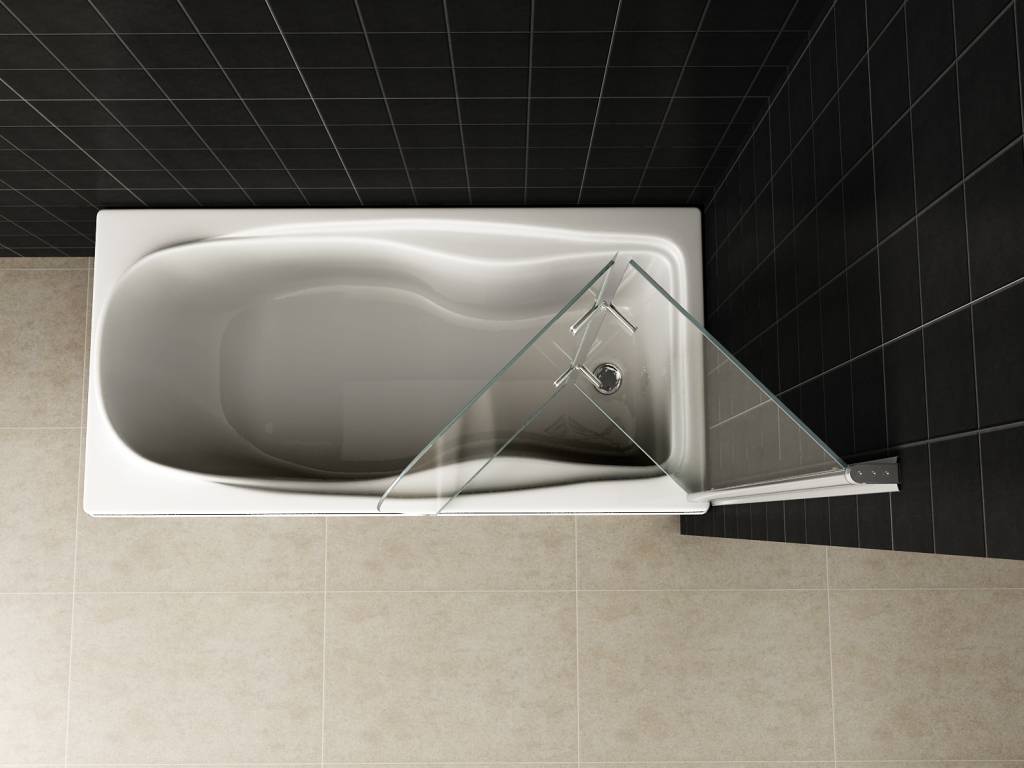 Badwand, 2-delig inklapbaar, 1000x1400, 6mm NANO glas, chroom profiel,