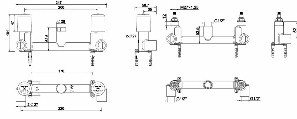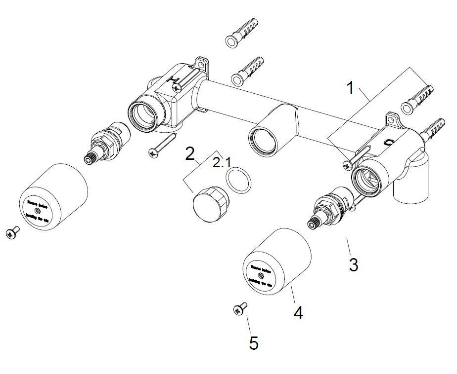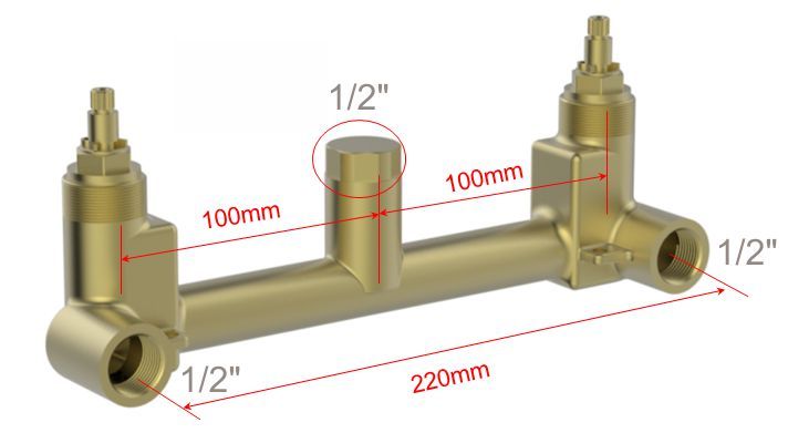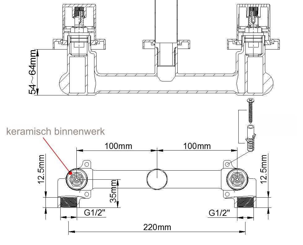 Universeel inbouwdeel 2-knops wastafelmengkraan, Te combineren met wastafelkraan-afbouwdelen, met keramische binnenwerken, inbouwdiepte 54mm-64mm, 1/2" binnendraad toevoer-aansluitingen, 1/2" binnendraad uitloop-aansluiting, Met beschermkappen en afdichti
