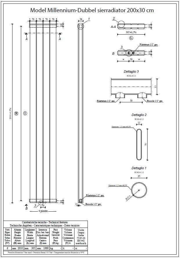 Millennium-Dubbel sierradiator 200x30 wit, 974 watt (volgens EN-442 Norm), 8 elementen (4 voor en 4 achter), Inclusief midden-onderaansluiting h-h 50mm 1/2", 2 jaar garantie, Kleur: RAL 9010 wit, Inclusief ophangset,