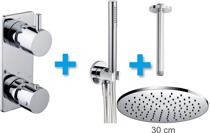One-Pack inbouwthermostaatset type 3 (30cm) Bestaande uit: 1 29.3960 Caral 2 weg inbouwthermostaat 1 29.3800 handdouchehouder 1 29.3830 handdouche rond 1 30.3530 doucheslang 150cm 1 29.3816 30cm hoofddouche rond 1 29.3860 plafond aansluiting rond