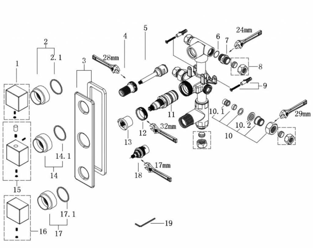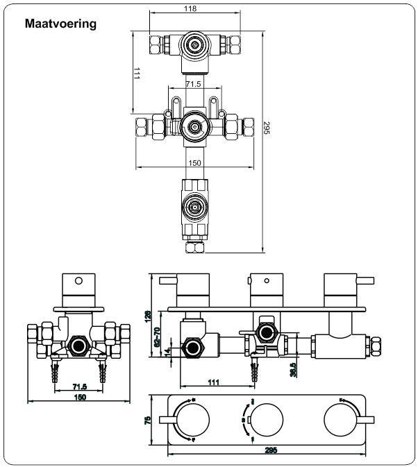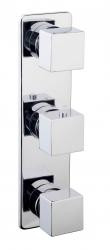 Rombo inbouw 3-wegs douchethermostaat rond chroom, Inbouwdeel compleet met afbouwdeel chroom, 2xknel 15mm aansluiting, Bodemplaat 75x185, -de onderste knop is een aan/uit knop voor één uitgang, -de middelste knop is de thermostaatbediening met begrenzer o
