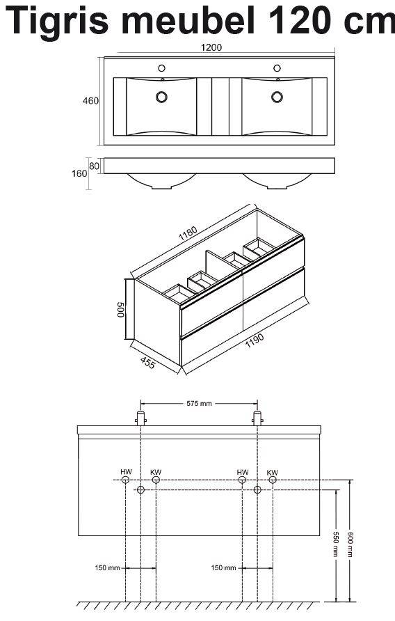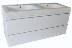 Tigris Onderkast + dubbele wastafel + 4 laden 1200x460 wit, Onderkast hoogglans wit gelakt, Hoogte: 580mm, Diepte: 460mm, Laden zijn voorzien van Luxe DTC geleiders, Wastafel van kunstmarmer,