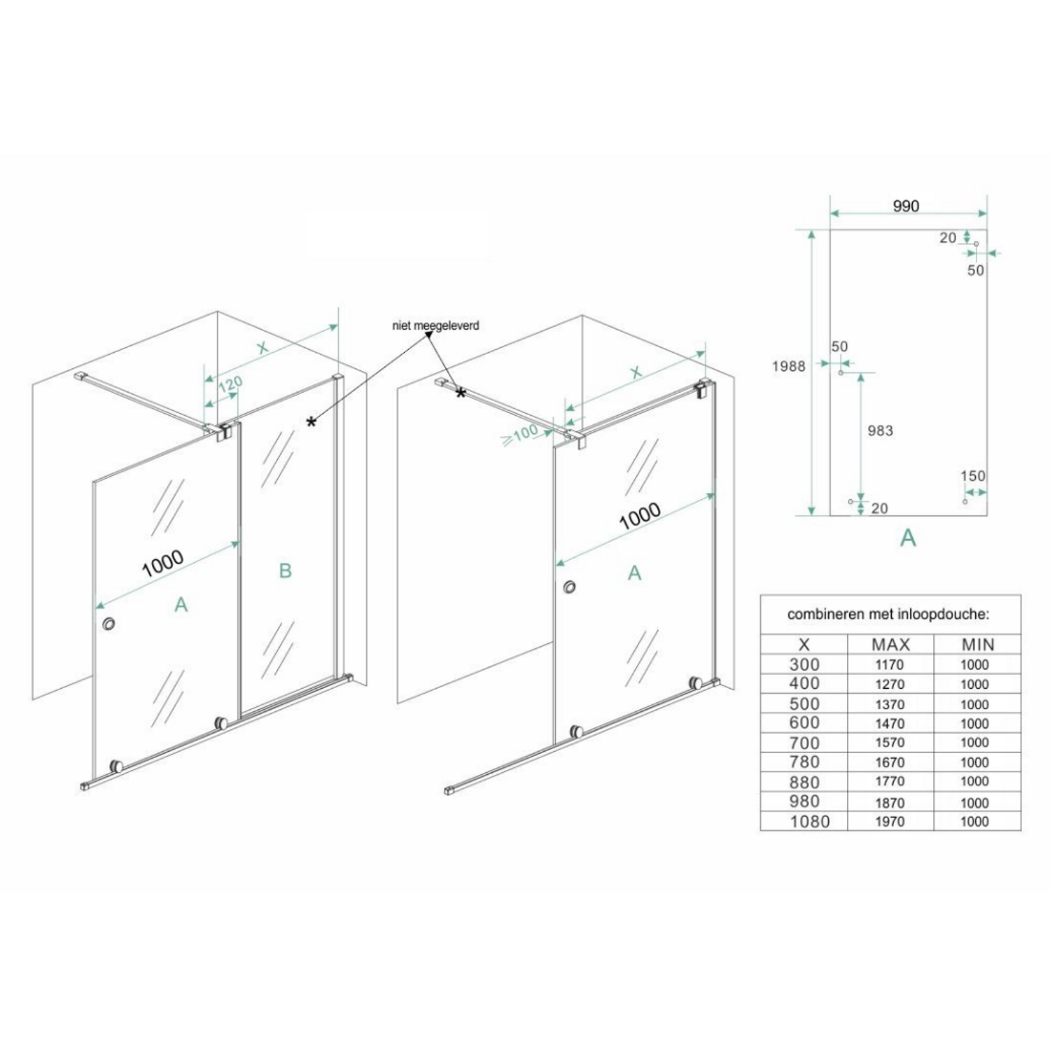 Een schuifdeur van 1000mm die gecombineerd kan worden met de inloopdouches 10mm NANO van Korver Holland