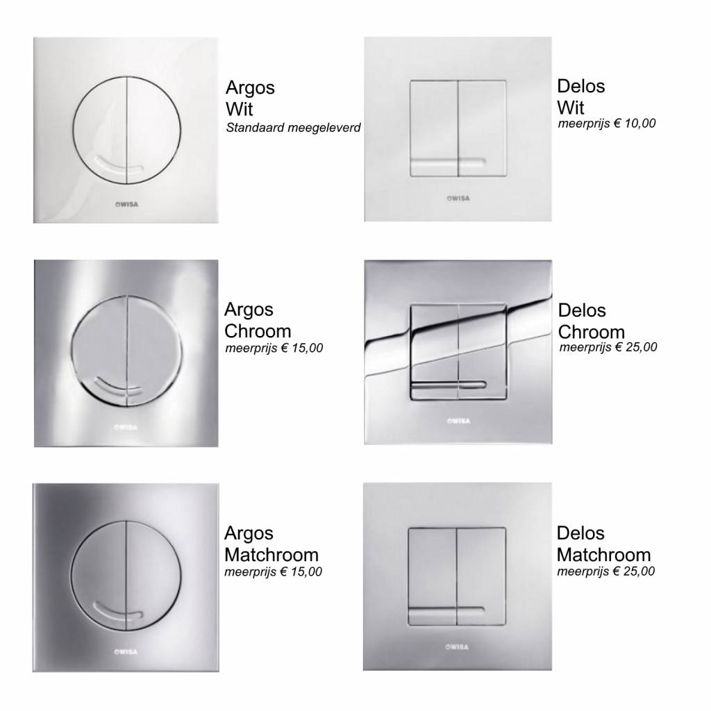 De drukplaten uit de Argos en Delos serie zijn vierkante drukplaten met verschillende 2-toets varianten. De Argos serie heeft ronde toetsen en de Delos serie vierkant. Alle drukplaten zijn voorzien van een waterbesparende 2 toets systeem. De linker knop is voor een grote spoeling. In te stellen tussen de 4,5 tot 7,5 liter water per spoelbeurt. De rechter knop is in te stellen tussen de 3 tot 4 liter water. Op die manier wordt er veel water bespaard wat goed is voor het milieu en voor uw portemonnee.